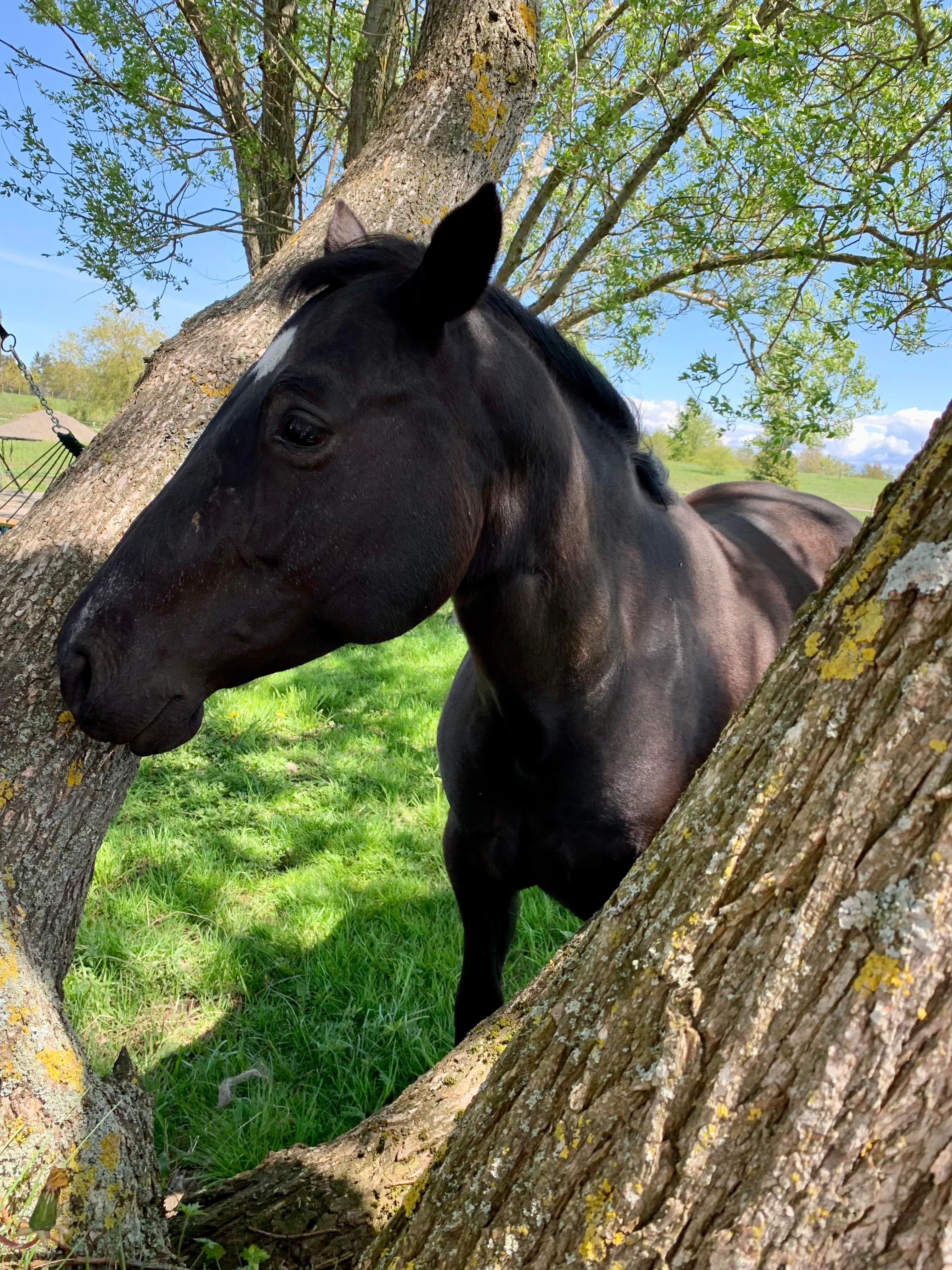 Cezanne is an alpha mare, top of the pecking order. She has both girlfriends and boyfriends, depending on her mood. She is super-sweet with humans and is quick to warm up and cuddle. She has a devilish side and will sass you but immediately behaves if you tell her to quit. This is why she needs a confident handler but you don’t have to be an advanced rider.