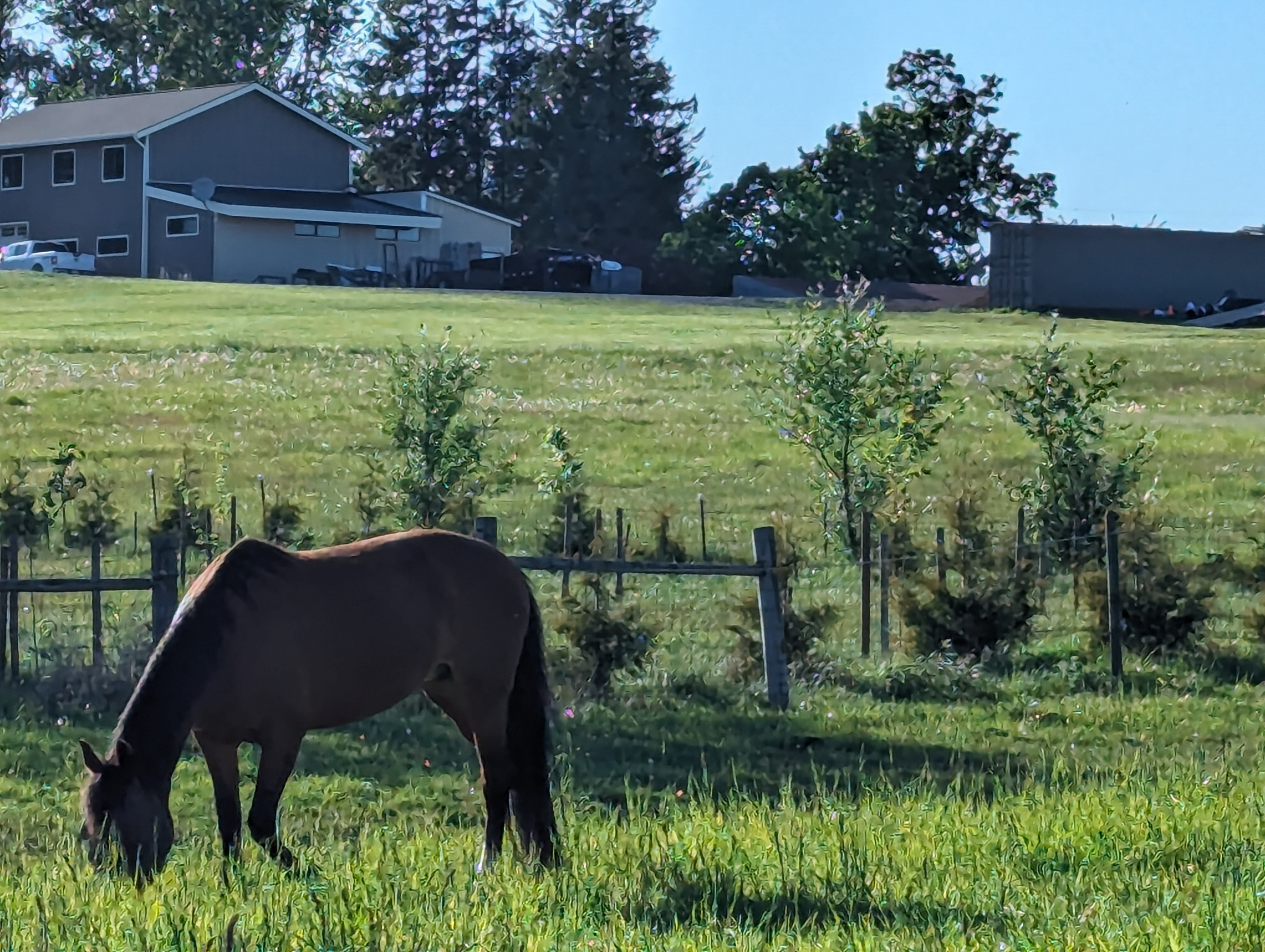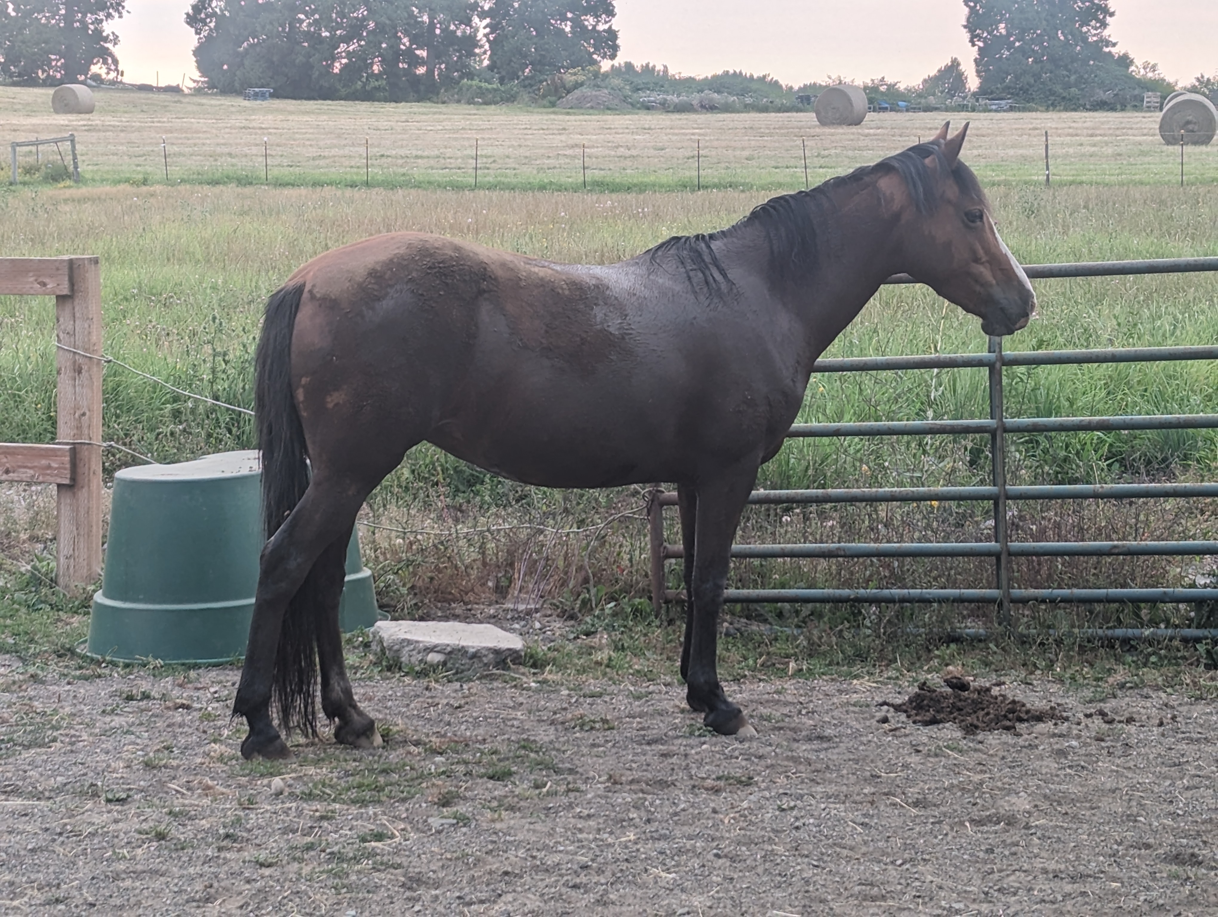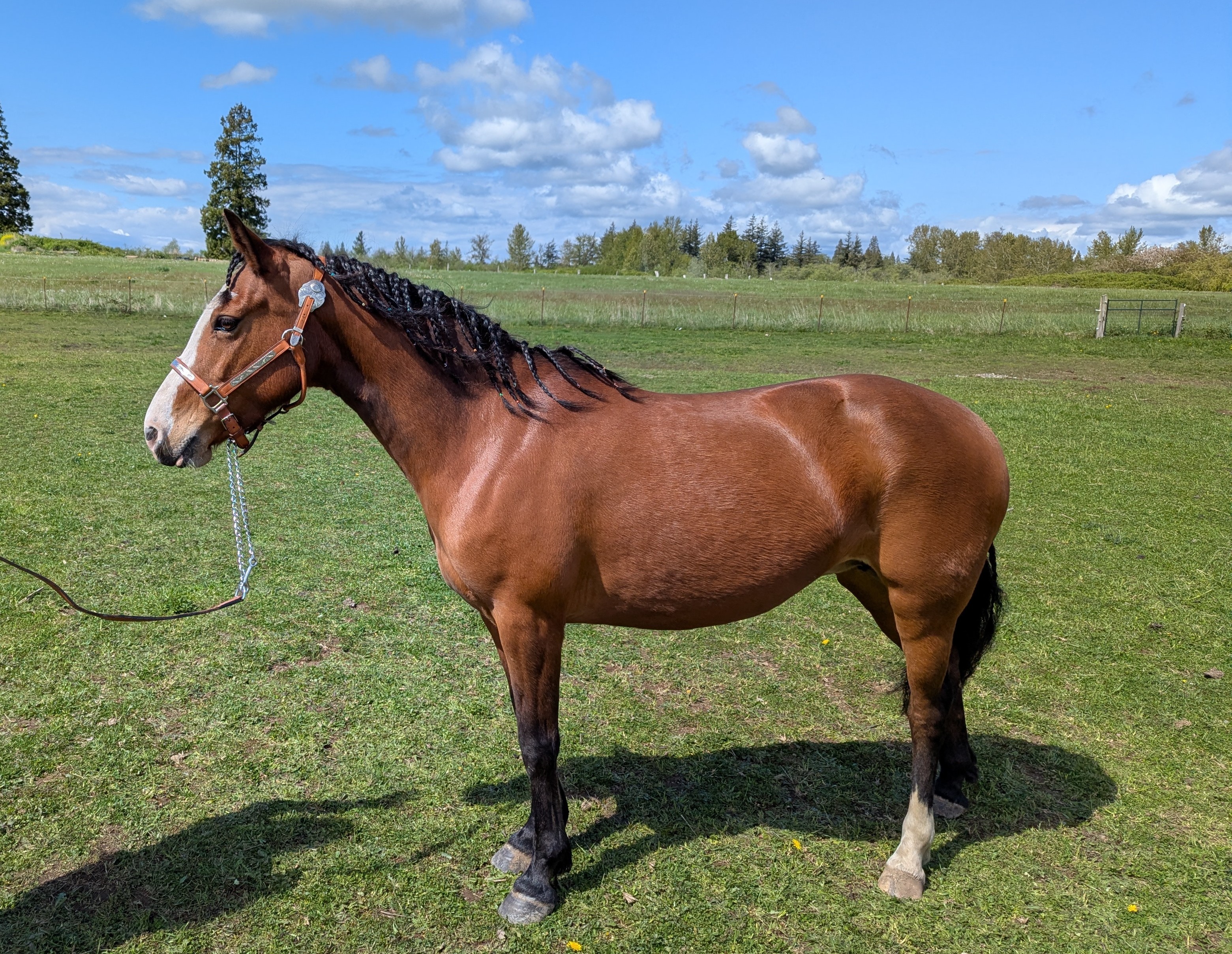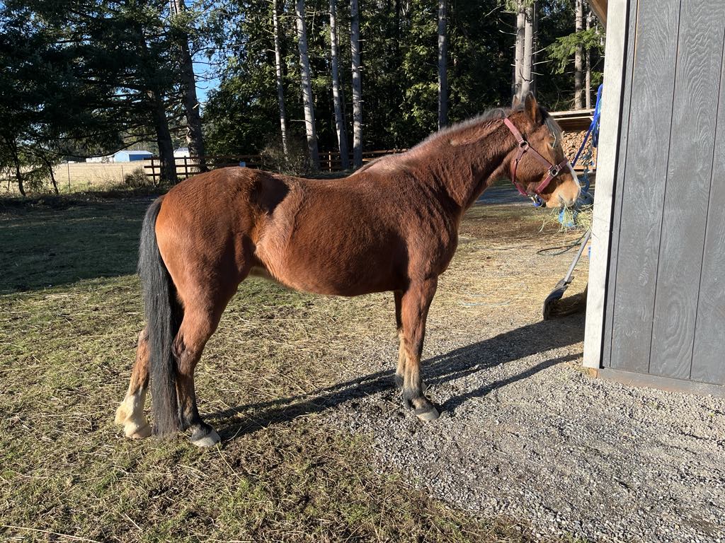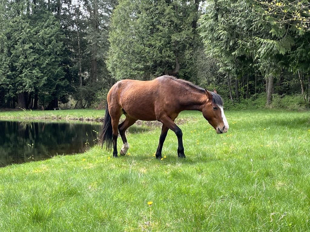 Riba is an incredibly healthy, hearty girl. She’s 14.1hh and 750#. She has amazingly hard mustang hooves so goes barefoot. She’s good for the farrier. She is a truly easy keeper…..meaning she manages her own weight when on pasture so doesn’t need a muzzle. She maintains her weight on local grass hay with Enrich Plus ration balancer and soaked beet pulp. She’s up to date on vacc (5way+WNV), worming, and feet. She last had her teeth done May 2023. She’s had no illness or injury since I’ve had her, Kulshan has her vet records.