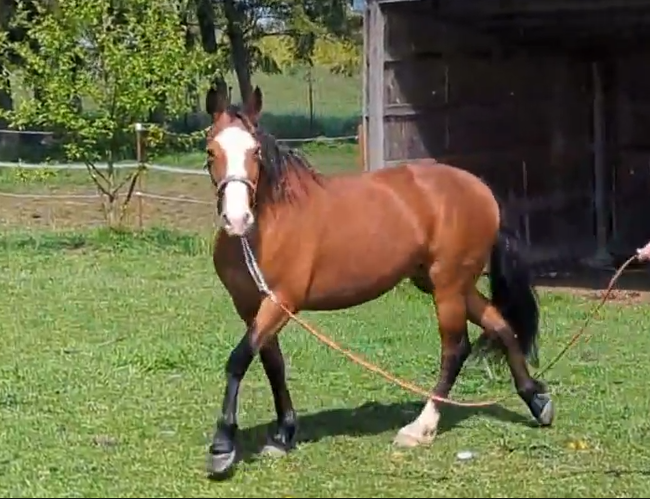 Riba is slow to warm up but once she does she is trusting. She’s had limited trailering experience but loads inside 10 minutes. She’s been in hand on trails and is curious and light on the line. I can see her excelling as a trail horse. She’s jumped over a couple fences, in the years she’s been here (wooden fence separating her from her buddies, years ago) and has cute form. She LOVES water. Loves to roll in the pond. Her right side is her off side and she is very resistant to work on that side. She’s easy to roundpen both directions, but on a lunge line she can be difficult going to the right.